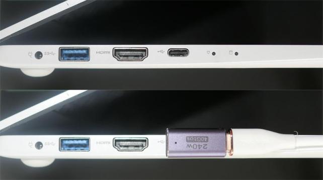 ノートPCの左側面の写真を見て戴くと判るのですが、このアダプターを逆方向に装着すると、HDMI/USB Type-A端子/電源端子に干渉するので、この方向にUSB Type-Cケーブルを出すのがベストです。