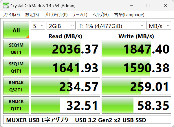 残念ながら、私が所有する最も高速な機器は、USB 3.2 Gen2 x2(20Gbps)に対応したポータブルSSDです。