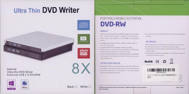 パッケージは、白バックに色違いの2つのドライブが印刷されていて、Ultra Thin DVD Writerというタイトルと共に、CD/DVD RW/DVD Multi Recorderのロゴと8倍速を意味するx8の文字が印字されている他、Windows 8 Compatible及びMacのロゴとExternal Ultra thin DVD Writer/External USB 3.0 DVDRWの文字が印字されています。