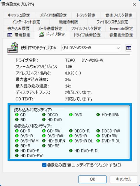 ディスクのライティングソフトウェアで、DVDドライブの詳細を見てみると、DVD-RWドライブは、TEAC製のDVD-RWドライブで、DVーW28S-Wという型番のドライブでした。