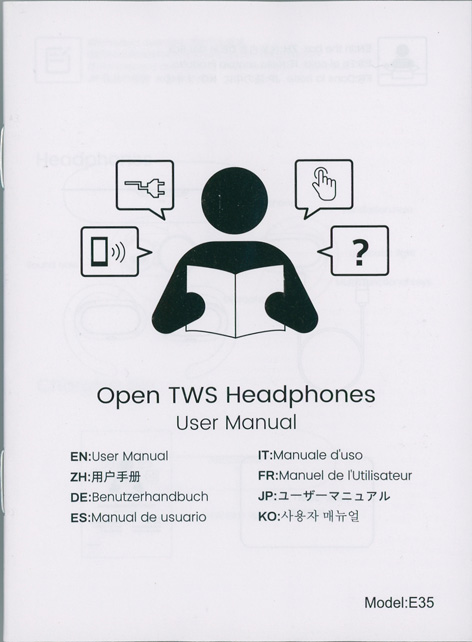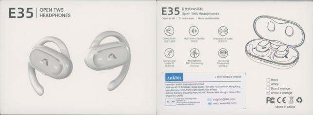 左肩にE35という型番と、OPEN TWS(True Wireless Stereo) HEADPHONESという文字が印字されています。