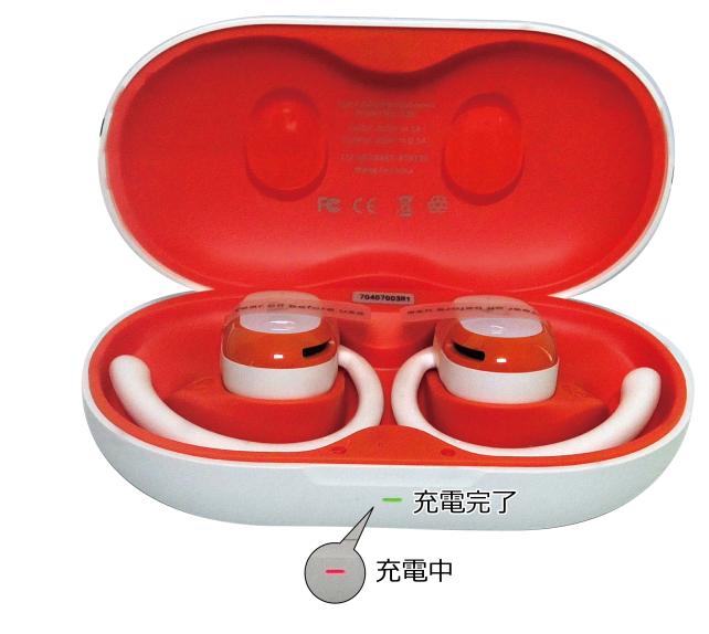耳掛け式イヤフォンを平面で充電する形状のため、充電ケースは結構大きめです。