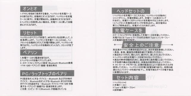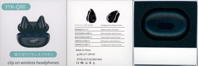 あとは、型番(YYK-Q80)と耳介式ワイヤレスイヤフォン/clip on wireless headphonesの文字が印字されています。