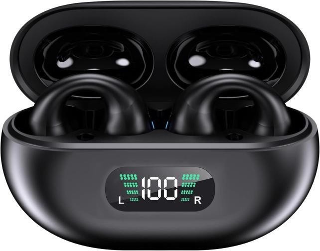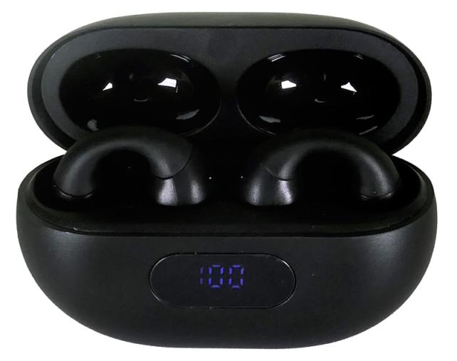 パッケージは、白色背景に、充電ケースとイヤーカフ型ヘッドフォンの写真が印刷されています。