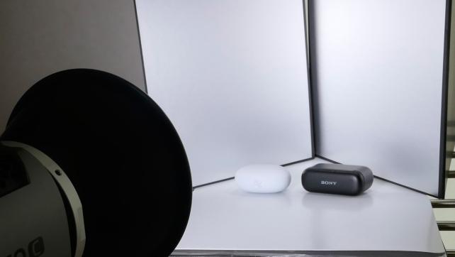 撮影風景写真を添付しますが、正面から65WのLED照明を使い、台の上に、DAISOの白まな板(A3位の薄いもの)を下地として、レフ板を、銀色にして、2つを二つ折りで立てて背景にしています。