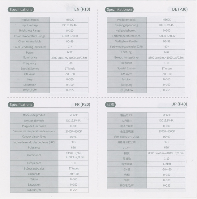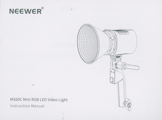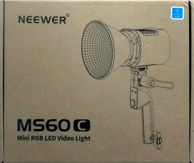 パッケージは、茶の段ボールに、メーカーロゴとハンドルに取り付けた標準リフレクター付きLEDライトのイラスト、製品型番(MS60C)、Mini RGB LED Video Lightという文字が記載されていました。