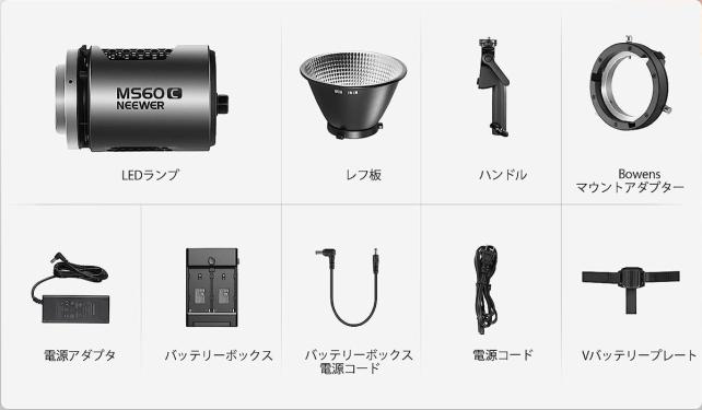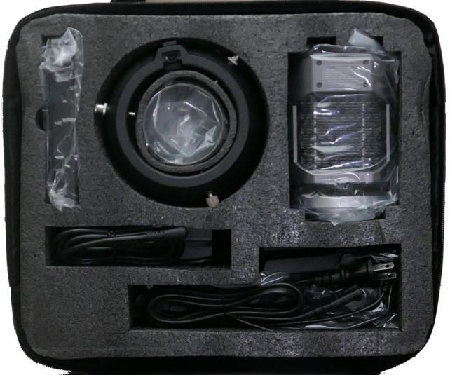 キャリングケースには、LEDライト、標準リフレクター、電源アダプター、電源コード、ハンドル、バッテリーボックス、Bowensマウントアダプター、バッテリーボックス電源ケーブル、電源アダプター固定用ストラップ、ソフトウェア説明書、取扱説明書、取扱説明書正誤表が入っていました。