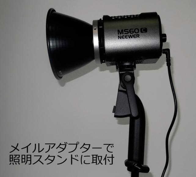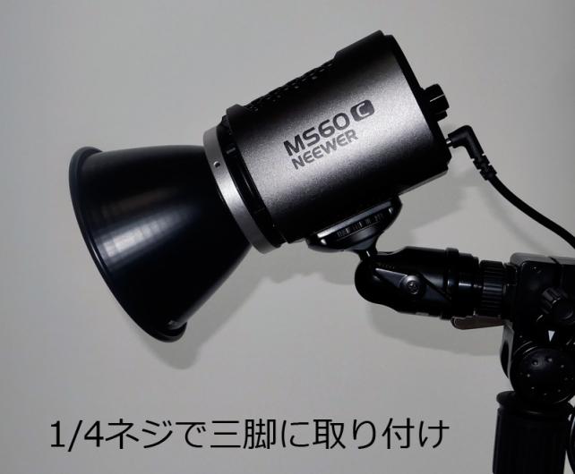 このように、このLEDライトは、ハンディライトとしても照明スタンドに固定しても運用が可能で、更に、1/4ネジが付いているので、一般的な三脚にボールヘッド等の運台を介して固定することも可能です。