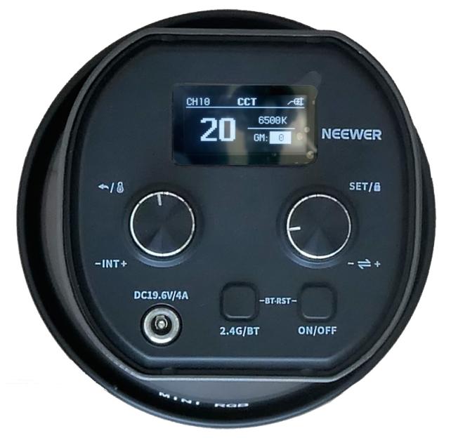 LEDライトのコントロールパネルには、表示器と二つのローターリーエンコーダーと、二つのプッシュボタンがあります。