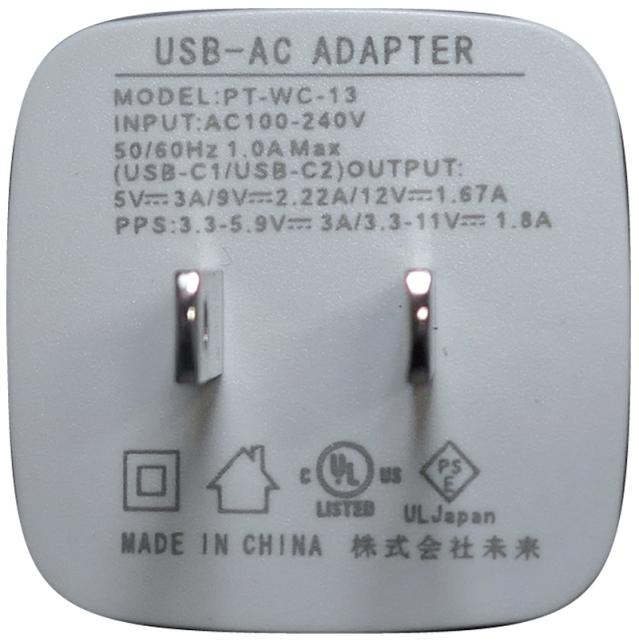 銘版には、2基の充電ポート各々が、USB PDでは、5V/3A、9V/2.22A、12V/1.67A