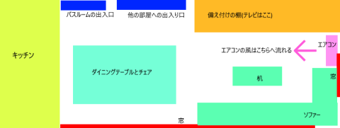 部屋はこんな感じなんで、エアコンの風はソファーにはきません。