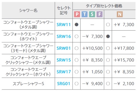 標準ではメッキタイプのコンフォートウェーブシャワーが装備されますが、