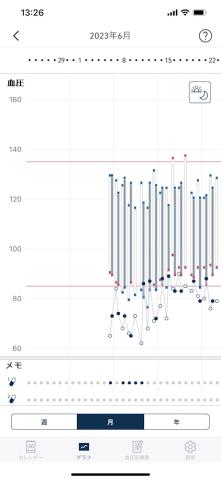 測定した毎日の血圧データを「週」「月」「年」別にグラフ確認できます。