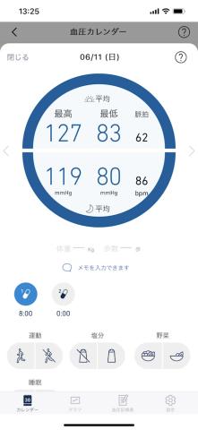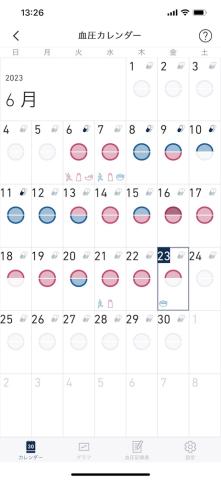 高血圧でないときは「青」。高血圧気味だと「赤」、めっちゃ高血圧気味だと「濃い赤」で表示されます。