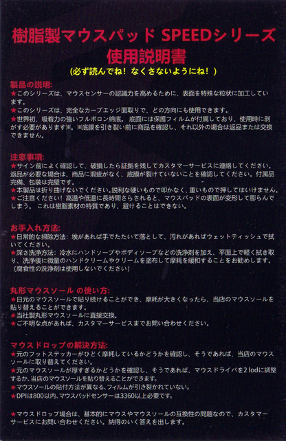 このマウスパッドは、透明のPET袋に、マウスパッドの他、マウスソール及びアルコールパッド、取扱説明書が同梱されていました。