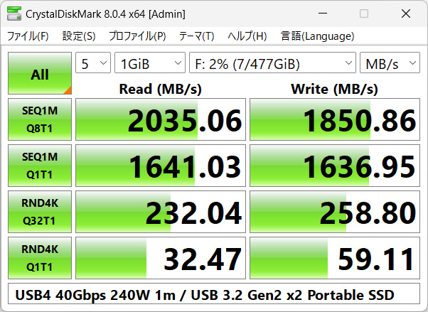 手持ちのUSB 3.2 Gen2 x2(20Gbps)対応のポータブルSSDを使って、DiskMarkで読み書き速度を計測してみましたが、20Gbpsの読み書き速度でした。