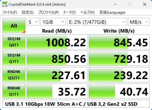 このケーブルを使って、手持ちのポータブルSSDをPCのUSB Gen2ポートに接続してDiskMarkを走らせて、読み書き速度を測定してみました。