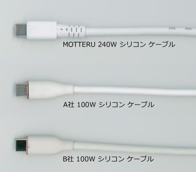保有している他の充電用USB Type-Cシリコンケーブル(100W)と比較すると、240Wという容量のためか、若干太めで、太い分若干硬めです。