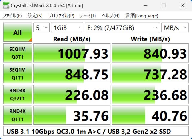 このケーブルを使って、手持ちのポータブルSSDをPCのUSB Gen2ポートに接続してDiskMarkを走らせて、読み書き速度を測定してみました。