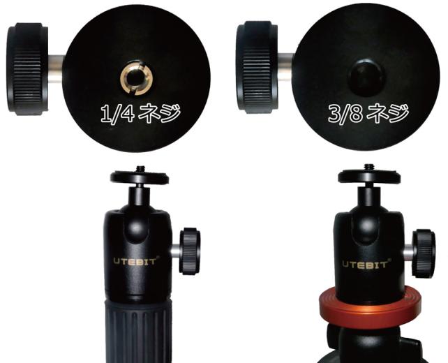 この雲台の底部には、3/8ネジ穴に、3/8>1/4変換ネジが付いていて、3/8ネジ三脚にも、1/4ネジ三脚にも取り付けることが可能です。