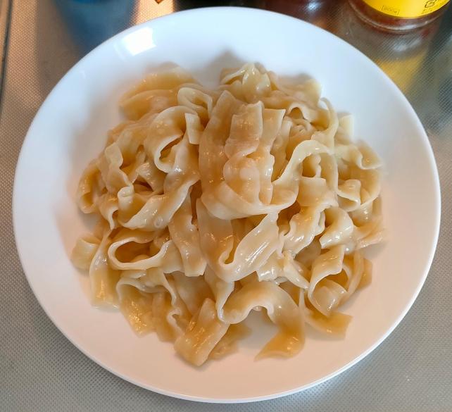 結論:新触感の中華麺です。形状が近いだけで刀削麵ではないです。刀削麺では触感が不均等さがありますが、こちらは比較的に不均等さが少なく感じます。そもそもこれは中華麺です。