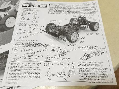 説明書には、現代のパーツでのチューニング方法も載ってました。ベアリングはホットショットと共通。DF-2というオフロードカーのユニバーサルシャフトが流用できます。ダンパーもレース用のアルミタイプが装着可能。この時代のタイヤはプラスチックの3点支持のホイールハブをつけるタイプでしたが、六角ハブを使えば、現代のホイール、タイヤもつけられます。