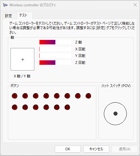 十字キーはハットスイッチ、ジョイスティックはX軸/Y軸が動作する。