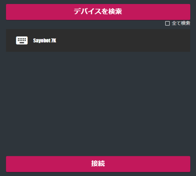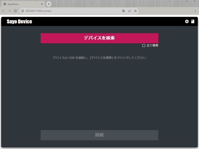 起動するとブラウザが立ち上がり下記の画面が出る。製品を接続した状態でデバイス検索を押す。