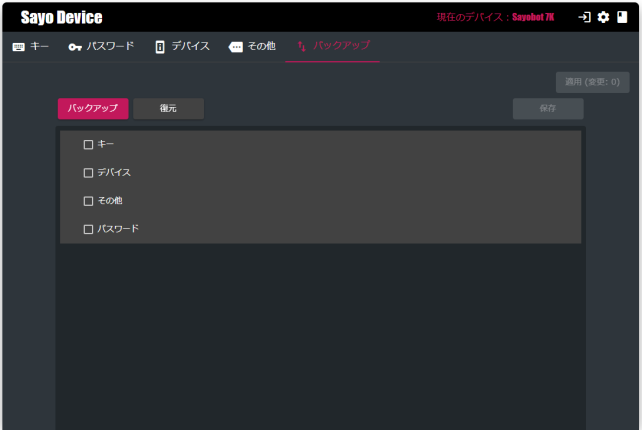 バックアップタブでは設定情報のバックアップとバックアップファイルからの復元が行えるらしい。