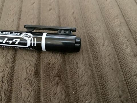 他のマッキーは殆どの場合両端で異なった字の太さのペン先が用意されていますが、これはノックタイプであるためペン先は片側のみで、もう片方の端を押すことでペン先の出し入れが出来る方式となっています。