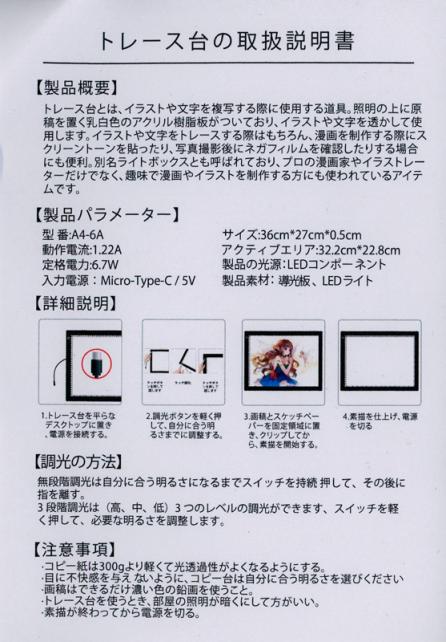 裏面には、トレース台の使い方と、スペックが記載されています。