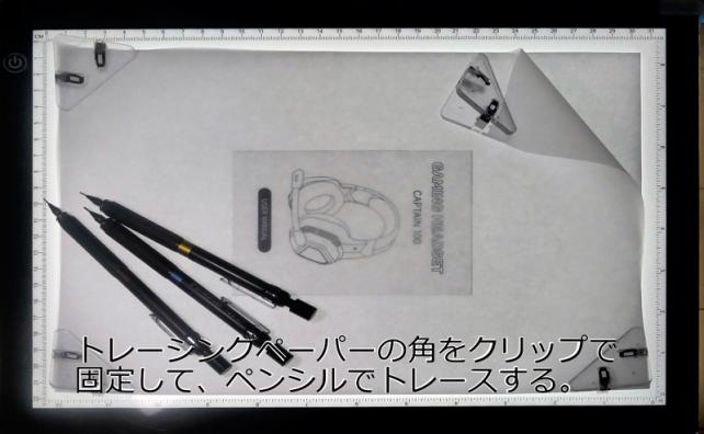 付属のクリップで、原稿とトレーシングペーパーを固定し、ずれを防ぎ、ペンで、トレースを行います。