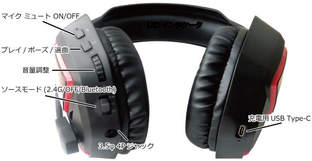 ヘッドセットの左側(マイクが付いている方)のスピーカーの後方上から、マイク ミュートのON/OFFボタン、プレイ/ポーズ/選曲(曲の前後送りは、ダブルクリック/トリプルクリック)ボタン、ボリューム調整ノブ、ソースモード切替スイッチ、有線接続用3.5φケーブルコネクターが付いています。