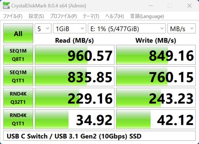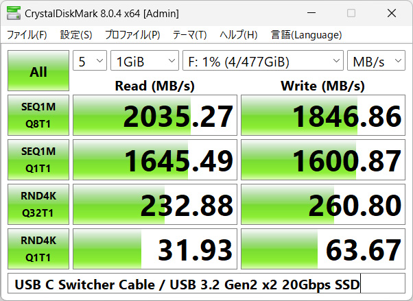試しに、20GbpsのUSB SSDを繋いで、デスクトップPCの20Gbpsポートに挿してDiskMarkを走らせたところ、20Gbpsでの通信が可能でした。