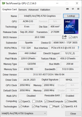 K6マザーボードを採用していますが、Arc A750では最良のパフォーマンスを得る