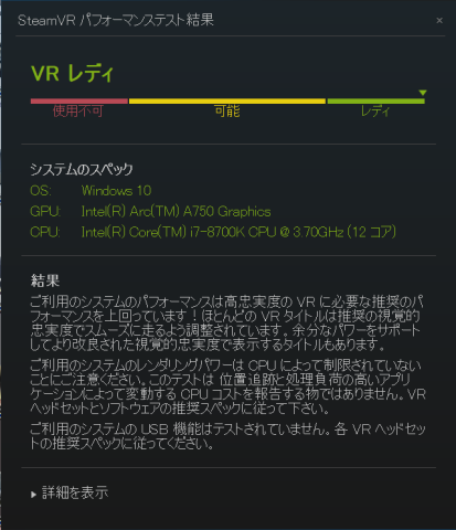 SteamVR Performance TestではVRレディ判定されるので、2万円前半で