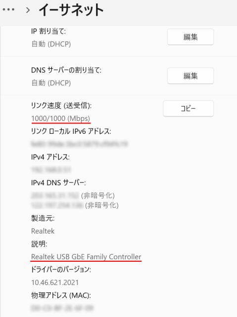 また、イーサネットのプロパティを見ると、上り、下り共に、1000Mbpsでつながっていることが確認できました。