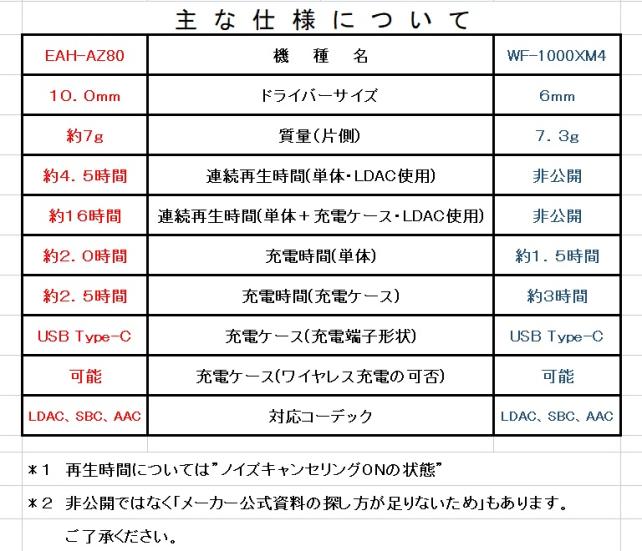 今回購入したEAH-AZ80と、これまで使用していたWF-1000XM4の簡単な比較表を作ってみましたので参考にしていただければ幸いです。