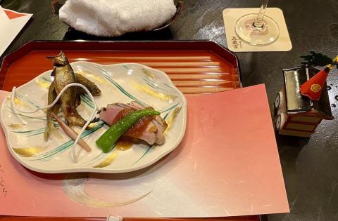 若鮎の塩焼きに添えられている蓼酢は長刀鉾を模した容器