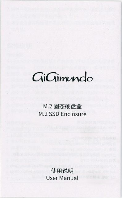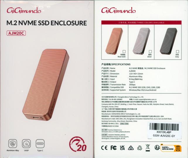 パッケージは、メーカーロゴと、M.2 NVME SSD ENCLOSUREという商品名及び型番が印字されていて、商品写真は、購入商品とは異なる色の商品写真が印刷されています。