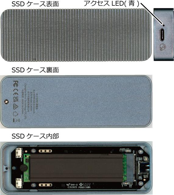 ケースの外観は、USB Type-C端子の横にブルーLEDのアクセスランプがあります。