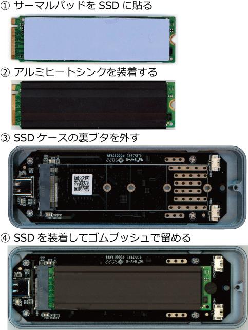 搭載するSSDにサーマルパッドを貼り、その上からアルミヒートシンクを被せてから、ケースの端子にSSDを差し込み、付属のボムブッシュでSSDをケースに固定します。