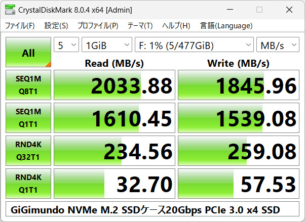 DiskMarkを走らせてみましたが、20Gbps対応であることが確認できました。