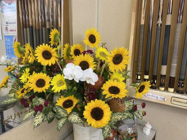 胡蝶蘭をセンターに据えつつも、勢いのある夏らしいひまわりを並べた