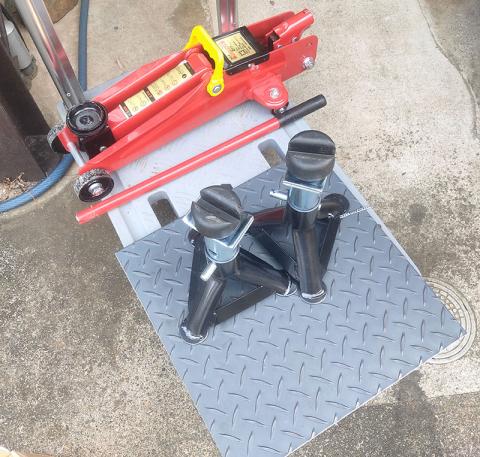 そしてフロアジャッキはその特性上鉄板がないと全くムリ。メリメリと地面に沈んでいって動かなくなる。