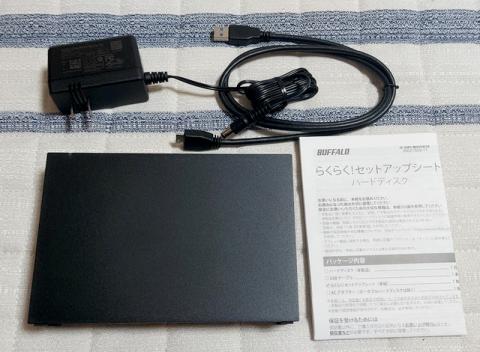 外付けHDD本体に、ACアダプタ、接続用のUSBケーブル、取扱説明書(保証書)。