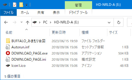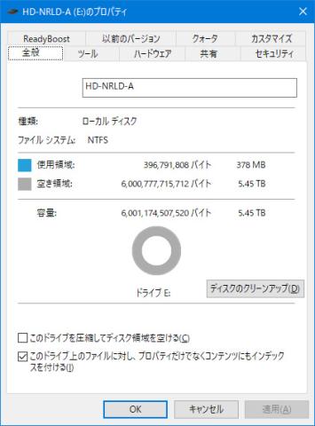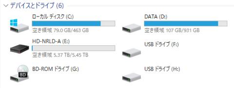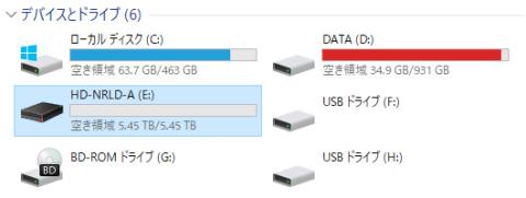USB変換HUBを通して接続しているので、HUBに搭載されたカードリーダー等もドライブとして表示されていますが「BUFFALO HD-NRLD6.0U3-BA」はEドライブになっています。