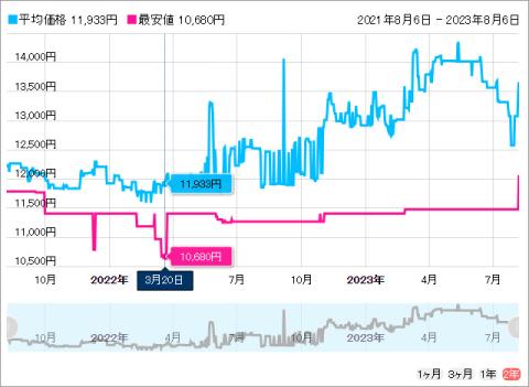 価格.comでベアドライブであるDT02ABA600Vの価格を見てみると、過去2年間での最安値が2022年の3月で10,680円。平均価格が11,933円で、これを書いている2023年8月9日現在の最安値は12,078円のようです。