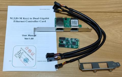 内容物:マニュアル、合格証、PCIブラケットとNICポートボード、接続ケーブル3本、M.2側ボード、PCI LowProfileブラケット