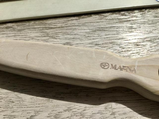 ヒノキ製の短柄に押されている焼き印は Marna マーナと読む日本製のようです。